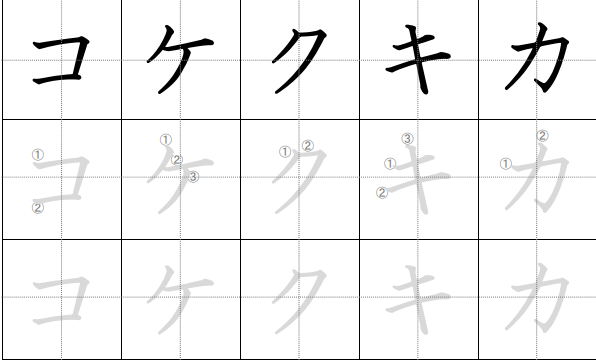 - ケ (ke): Memiliki tiga goresan: horizontal atas, vertikal, dan garis miring keluar.