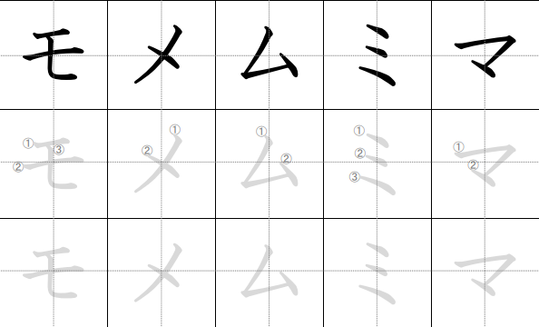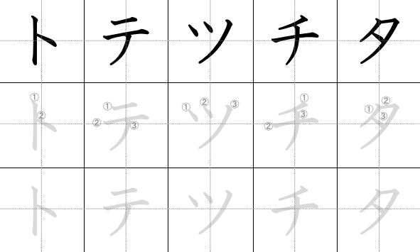 - ツ (tsu): Dua goresan pendek vertikal (mata), lalu satu goresan panjang dari kiri-atas ke kanan-bawah. Ingat: Tsu = mata vertikal.