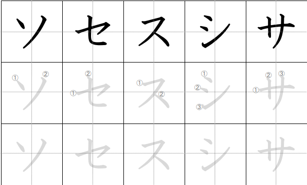 - ソ (so): Satu goresan pendek di atas (mata), lalu satu goresan panjang dari atas-tengah ke kanan-bawah. Ingat: So = mata di atas, turun miring.