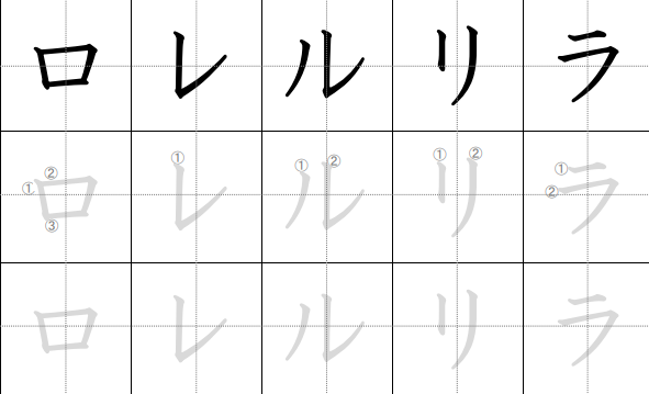 - ラ (ra): Seperti ウ dengan tambahan garis horizontal di atas.