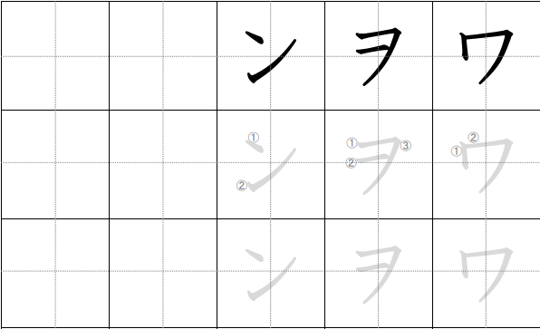 - シ (shi): Dua goresan pendek horizontal (mata), lalu satu goresan panjang dari atas-kiri ke kanan-bawah. Ingat: Shi = mata horisontal.