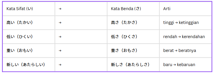 Akhiran 〜さ digunakan untuk mengubah kata sifat (形容詞・けいようし) menjadi kata benda abstrak yang menunjukkan tingkat, kuantitas, atau sifat dari sesuatu.