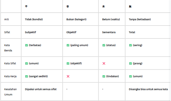 Awalan | Pola | Contoh | Arti | Catatan 非 + KB | 非会員 (hikaiin) | bukan anggota | Paling umum, objektif 無 + KB | 無関心 (mukanshin) | tidak peduli | Ketiadaan total 未 + KB | 未成年 (miseinen) | belum dewasa | Status/waktu 不 + KB | 不自由 (fujiyuu) | kesulitan | Terbatas Ketentuan: