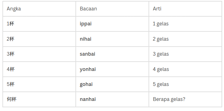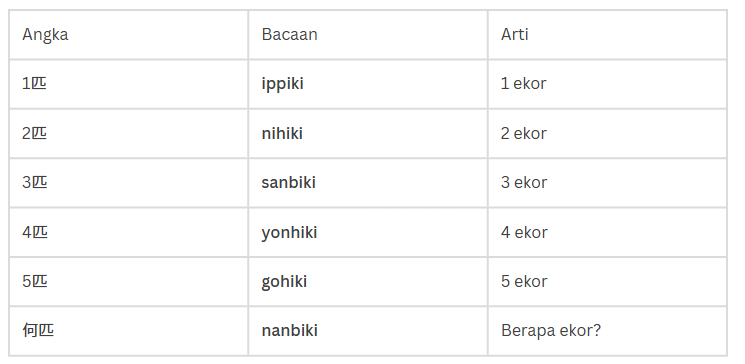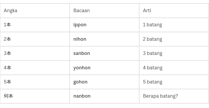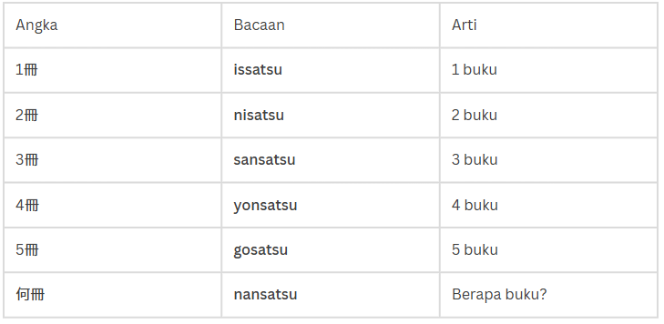 3. 〜冊 (satsu): Untuk buku, majalah, notebook4. 〜杯 (hai): Untuk gelas, cangkir, mangkuk (cairan dalam wadah), atau mi dalam mangkuk5. 〜個 (ko): Untuk benda kecil, umum, dan kompak (apel, bola, telur, kue, komputer)6. 〜本 (hon): Untuk benda panjang dan ramping (pensil, botol, pohon, payung). Perhatikan perubahan bunyi: hon → pon / bon7. 〜匹 (hiki): Untuk hewan kecil (kucing, anjing, ikan, serangga). Perhatikan perubahan bunyi: hiki → piki / biki8. 〜台 (dai): Untuk kendaraan dan mesin (mobil, sepeda, komputer, TV)